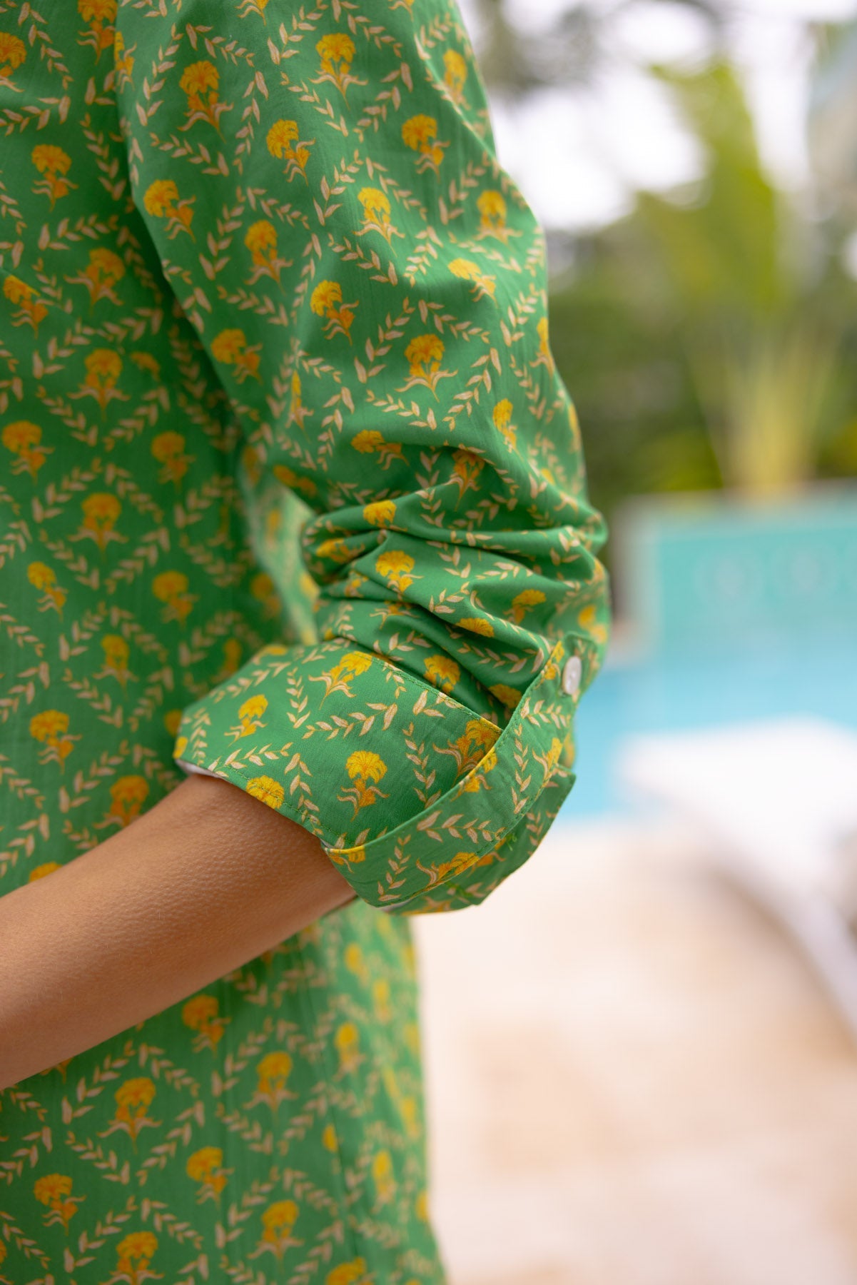 - Half length concealed mother-of-pearl button placket