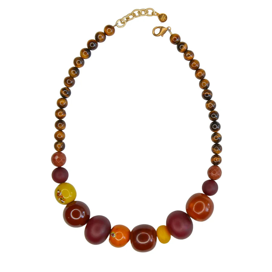 Bold yet balanced, the Guru Necklace in Rust is a power piece with a playful edge. A dynamic mix of matte jade, ceramic, vintage glass, and faceted gems are arranged in a rhythmic pattern that feels collected, not curated. The larger center beads ground the piece while shimmering accents catch the light from every angle. For the customer who loves personality, depth, and a necklace that starts conversations.