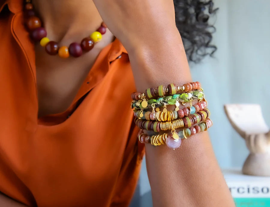 Bold, grounded, and just a little wild—the Kia Bracelet makes a statement with textured stripes. Handcrafted African beads are spaced with gleaming gold beads for a touch of movement and shine. A band of gemstones add a flash of elegant sparkle that elevates an otherwise more organic vibe. Stretch fit means it's easy to wear and even easier to give—no sizing needed. Perfect for collectors of layered color or bracelet addicts!