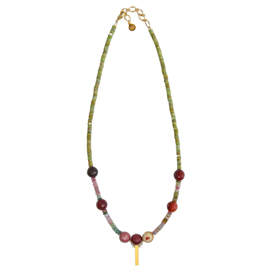We know you will be looking for a fresh take on the trends this season! The Mira Necklace checks all the boxes! Rich, earthy, and quietly radiant—Mira brings together hand-cut tourmaline, polished round gemstone, and a vertical bar of plated gold that adds just the right bit of shine. The beaded strand at the neck grounds the palette, while the mix of saturated and soft gemstone tones gives it a layered, lived-in feel. This is the piece your customer will reach for when she wants something grounded but unexpected. Our retailers tell us that our jewelry is consistently chosen by the girl that loves to spoil herself and "gets dressed" everyday.