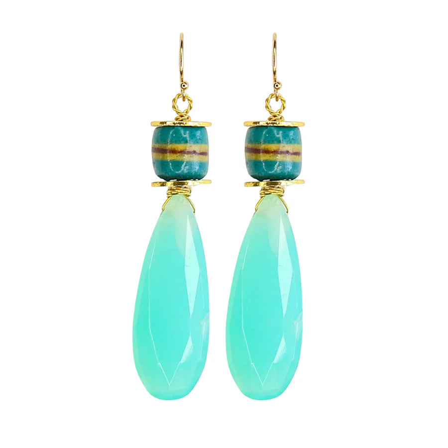 Light-catching and grounded, the Sefira Earring brings a sense of quiet strength. A faceted teardrop of chalcedony hangs with weight and grace, reflecting shades of green and deep blue as it moves. At the top, a hand-formed African bead adds a bold, unexpected finish—an echo of the Shiloh and Tribe designs. Gold-filled wire and French hooks keep the profile polished.