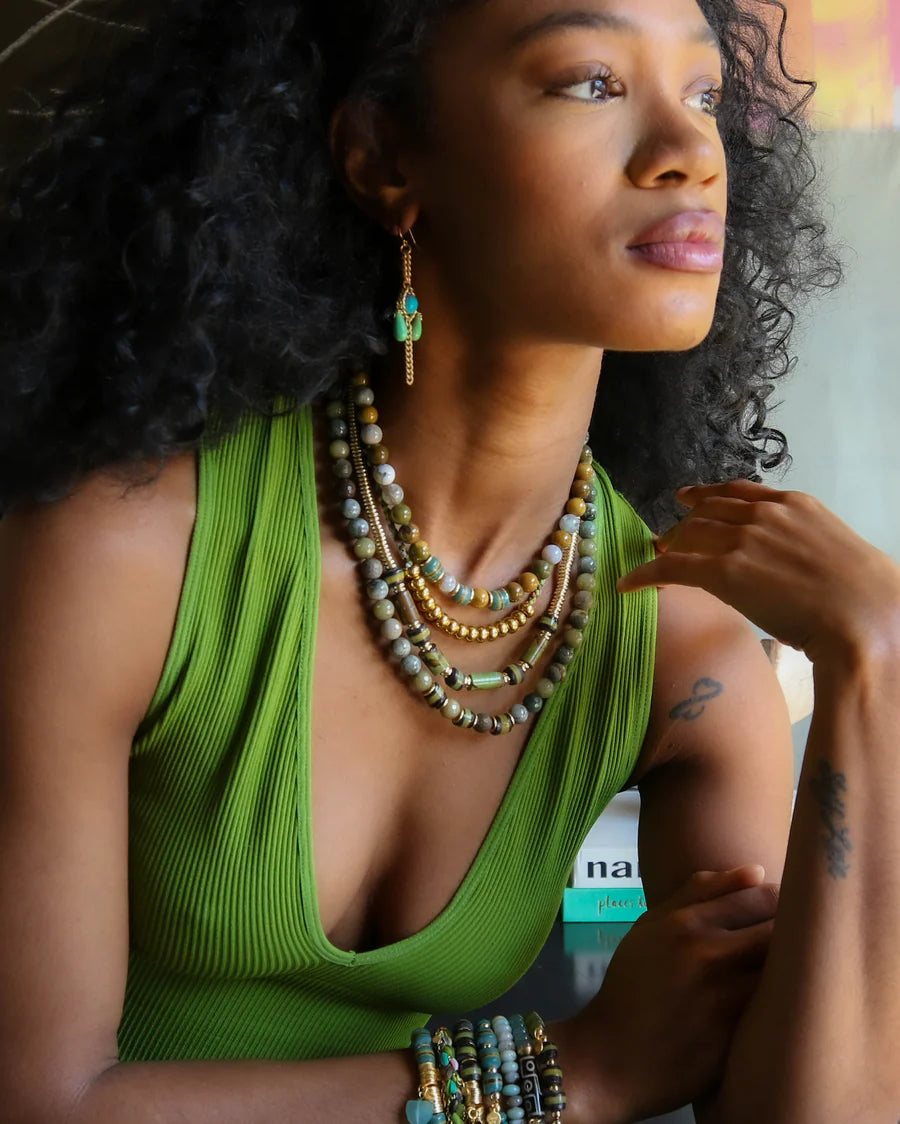 Bold yet balanced, the Sheba necklace is a staple piece with a playful edge. A dynamic mix of polished gemstones are arranged in a rhythmic pattern that feels collected, not curated. The center African beads ground the piece for a more organic feel. For the customer who loves personality, depth, and a fresh take on the season's trends.